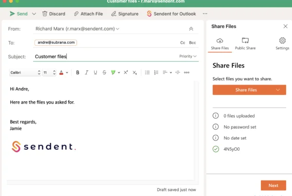 Sendent is known for its add-in that helps you share files and send emails safely and securely. It works with Outlook and is connected to the user’s private cloud instance on Nextcloud where their data is securely stored.